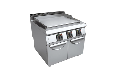 扒爐有台式和立式兩種。台式扒爐有平扒爐和坑扒爐兩種,大體結構相似,區別在:平扒爐表麵是一塊1~2cm厚的平整的鐵板,四周濾油:坑扒爐表麵是鐵鑄造的倒“T”字形鐵條,都是用燃氣、電或木炭作為能源。鐵板預熱後,再加油煎製,靠鐵板傳熱,使被加熱體均勻受熱。平扒爐可用於肉類、海鮮加工,還可以煎蛋、炒麵、炒飯等;坑扒爐用於肉類、海鮮等塊狀食材加工。台式扒爐體積小,具有方便、衛生、受熱均勻的效果。