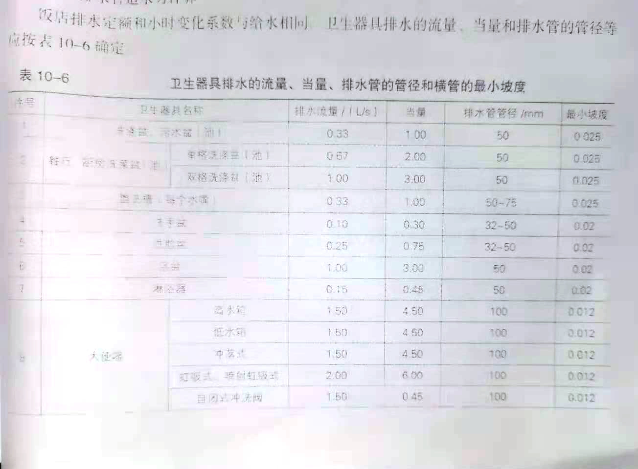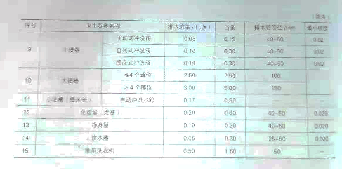 衛生器具排水的流量,當量、排水管的管徑和橫管的最小坡度
