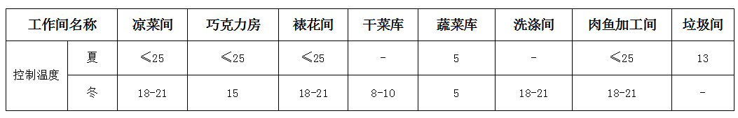 在規範中對工作專間有明確的定義:“指處理或短時間存放直接入口食品的專用操作間包括涼菜間、裱花間、備餐專間等。”叼嘿软件大全這裏的專間包含了其他專用工作間。各種專間溫度控製參照規範的要求和一般做法。設計人員要結合實際提出設計要求,例如.大型食堂和快餐店,在就餐準備之前有大量的食材要加,特別是魚、肉、禽、在室溫下擱置較長時間,不能隨時進行冷藏保鮮,夏季對室內的溫度就要嚴格控製,或增加保鮮設備的容積、便於及時冷藏,防止經過浸泡、擇洗、改刀的食材變質。嚴格控製各區溫度和濕度是控製微生物生長、保證食品安全的關鍵。不同區域環境有不同的溫度和濕度要求。主食庫、調料庫、幹品庫隻要控製濕度,各加工區需要控製溫度,見下表