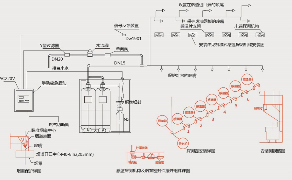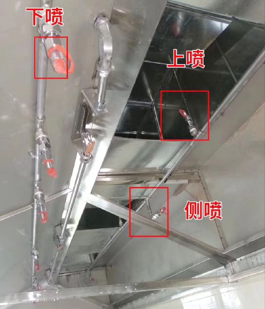 d.當係統藥劑噴完大約2-5秒後,係統上的閥門自動將噴水閥門打開。水流通過滅火劑管道和噴嘴噴灑,迅速冷卻和衝刷油料及灶台設備表麵。