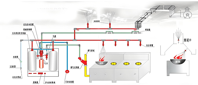 3、叼嘿软件下载大全專用滅火裝置:叼嘿软件下载大全專用滅火裝置是由滅火劑儲瓶與關斷燃料閥機構、機械驅動裝置、霧化與噴頭管網、感溫易熔金屬探測器與控製管路、手動應急啟動等組成。叼嘿软件下载大全安裝該係統之後,可24小時不間斷的對叼嘿软件下载大全的灶台、集油煙罩、排煙管道進行全方位的消防保護。