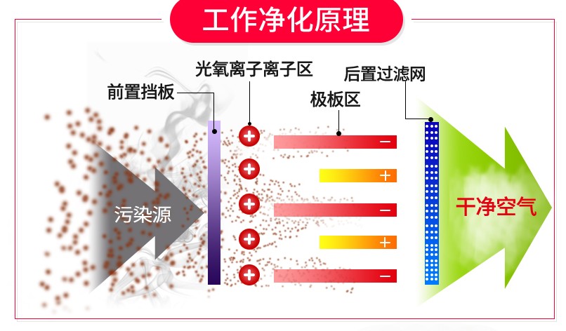 電場的設計使油煙粒子的運動速度較低,一般在零點幾秒內便能使油煙粒子荷上足夠的電荷,帶電粒子在電場中會受到電場力(庫侖力)的作用,其結果是油煙粒子被吸附到陽極上。因此電除油煙的除油煙率非常高,而且特別適用於捕捉粒徑較小和重量較輕的油煙粒子.
